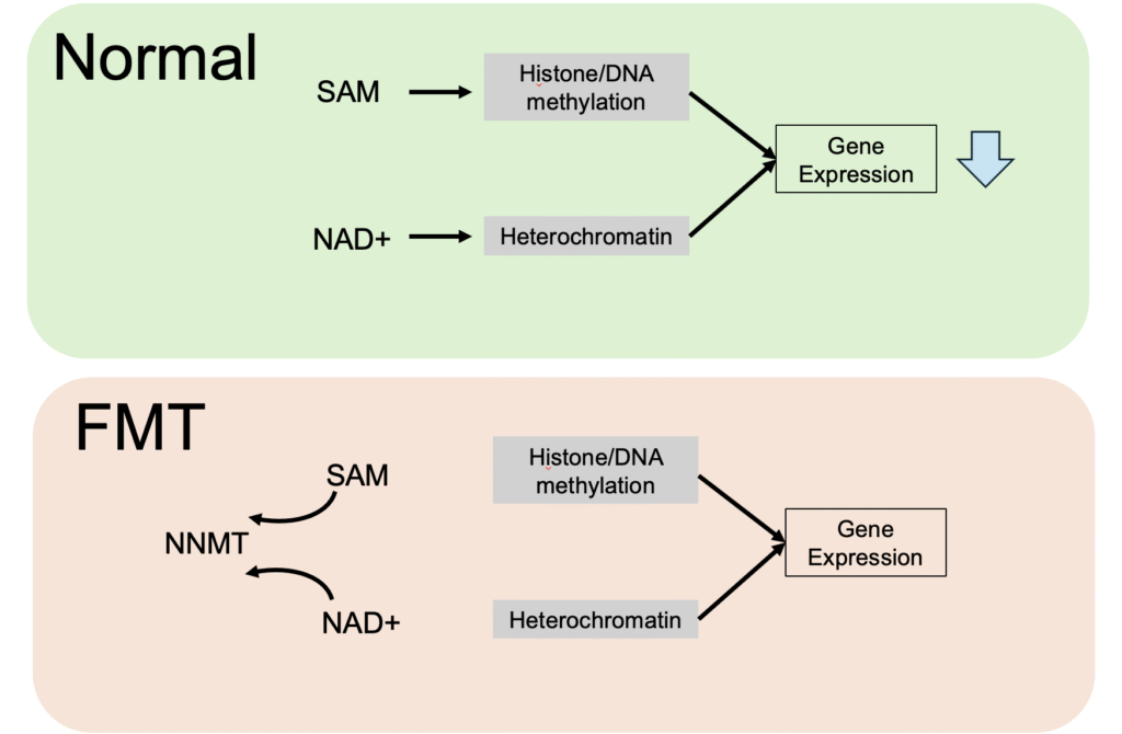 また、興味深いことに、NNMTという酵素が老化の早い段階から増加していた。この酵素は、遺伝子のスイッチをOFFにする「メチル化」に必要な材料(SAM)と、細胞のエネルギー通貨に関わるNAD+の両方を消費してしまう。これが、老化に伴ってDNAの通常閉じている領域(NADs/LADsと呼ばれるヘテロクロマチン領域)が開きやすくなる(ATAC-seqで観察された)ことに関与しているのかもしれん。まるで、普段は鍵のかかっている部屋の扉が、少しずつ開いていくような変化じゃな。